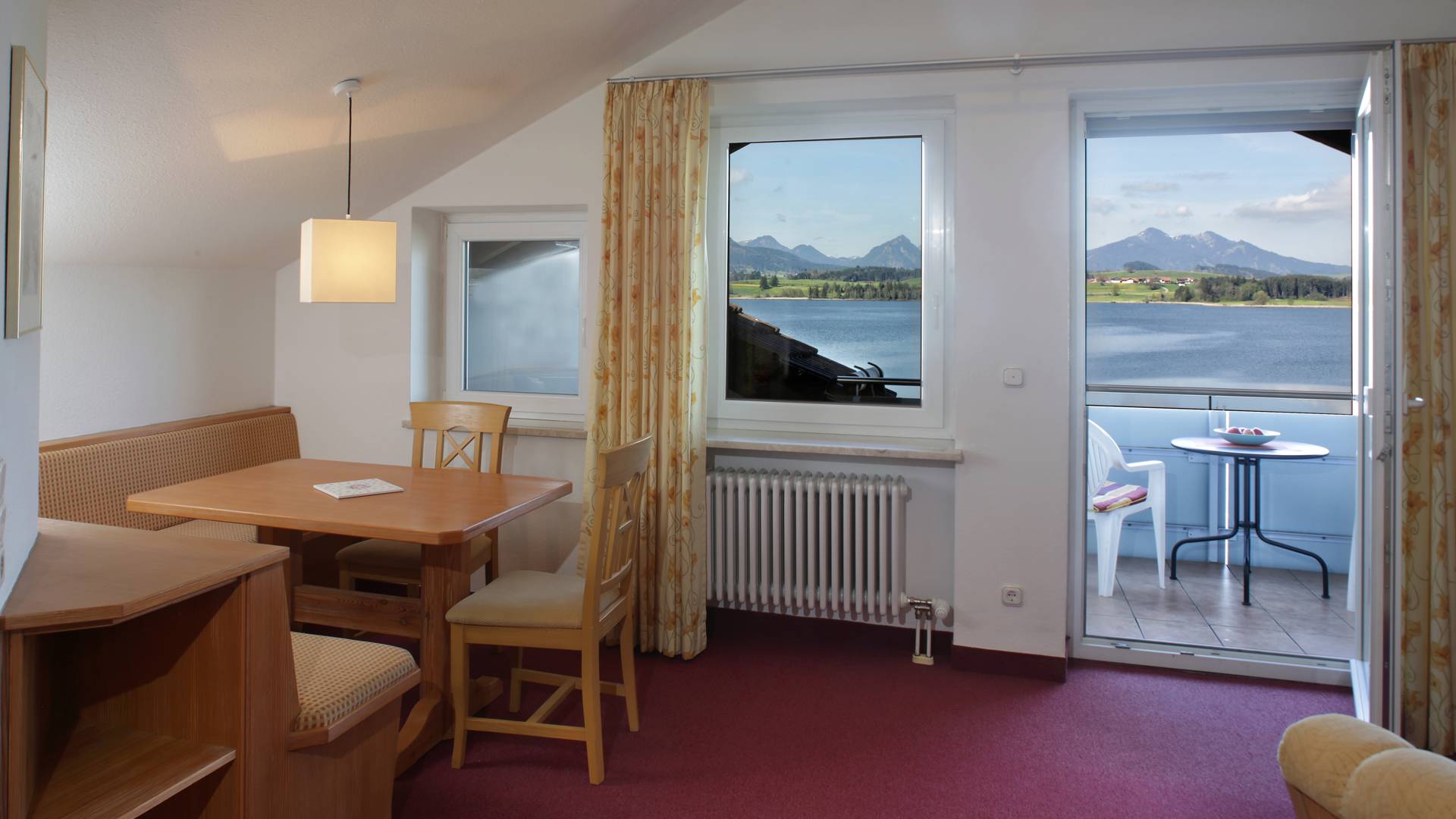 Die Ferienwohnung 12 im Landhaus Seeblick befindet sich im Dachgeschoss. Die 82 m² große Wohnung verfügt über ein Wohnzimmer, zwei separate Schlafzimmer sowie ein Badezimmer und eine Küche. Ein Schlafzimmer ist mit einem Doppelbett ausgestattet und in dem anderen Schlafzimmer erwartet Sie zwei Einzelbetten. Das Wohnzimmer bietet Ihnen genug Platz für gemeinsame Abende und von hier haben Sie auch Zugang zum großen Balkon. Genießen Sie ein Glas Wein mit Blick auf die Ammergauer-Alpen und den Hopfensee. In der Küche finden Sie alles, was Sie für den täglichen Bedarf benötigen. Für Ihre Fahrräder gibt es eine separate Fahrradgarage, welche Sie kostenlos nutzen können. Gerne können Sie einen Tiefgaragenstellplatz für € 5,00 pro Nacht hinzubuchen.